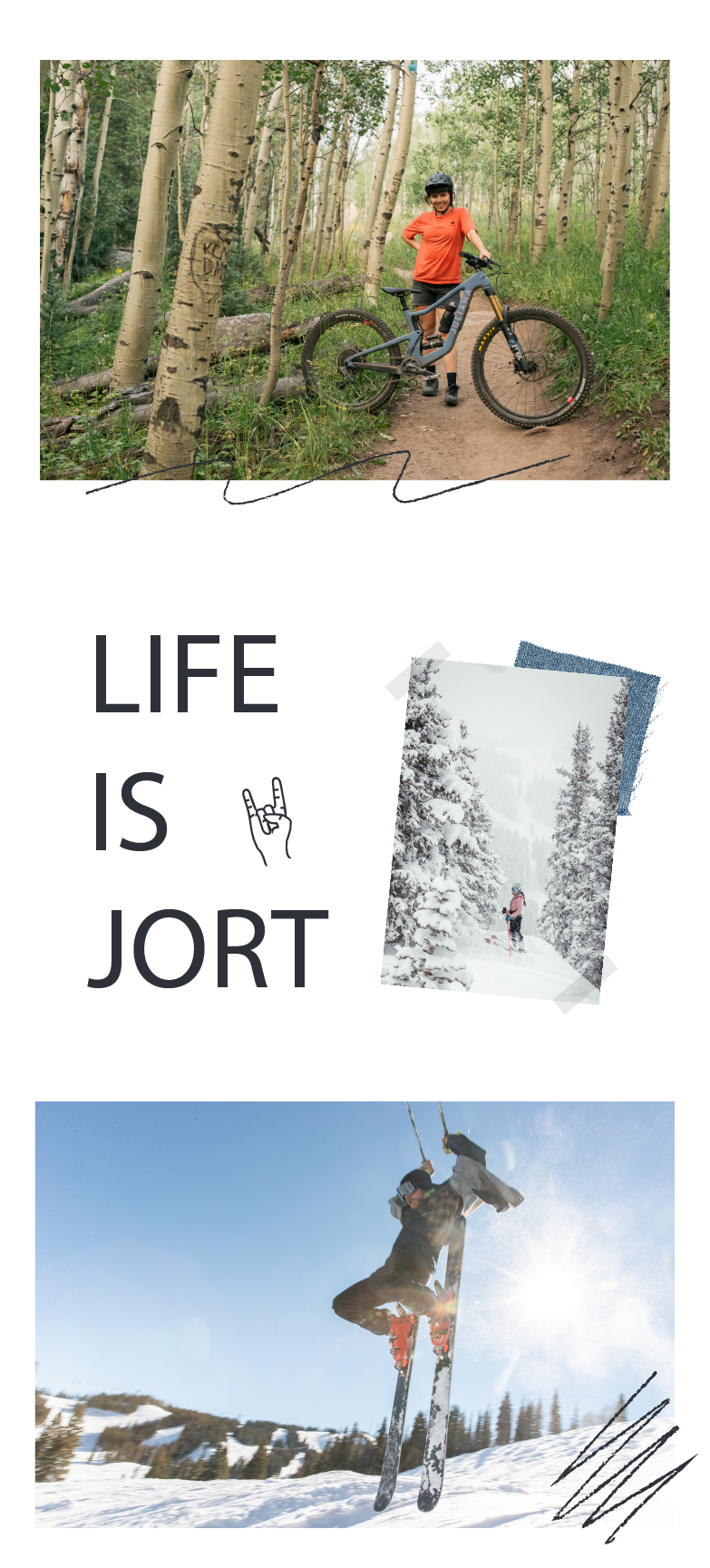 Between powder days in the Elk Mountains of Colorado a group of ski bums (while parking cars and pounding nails) started to envision a new kind of entity, a life force. We didn’t have a name yet, but we knew it would be the world’s first ‘jort brand’. Born from the desire for more, more spunk, rebelliousness, joy, creativity, and style. We think life is something to do your own way, on your own terms. And just like skiing and riding bikes, life should always be more of a dance than a race.