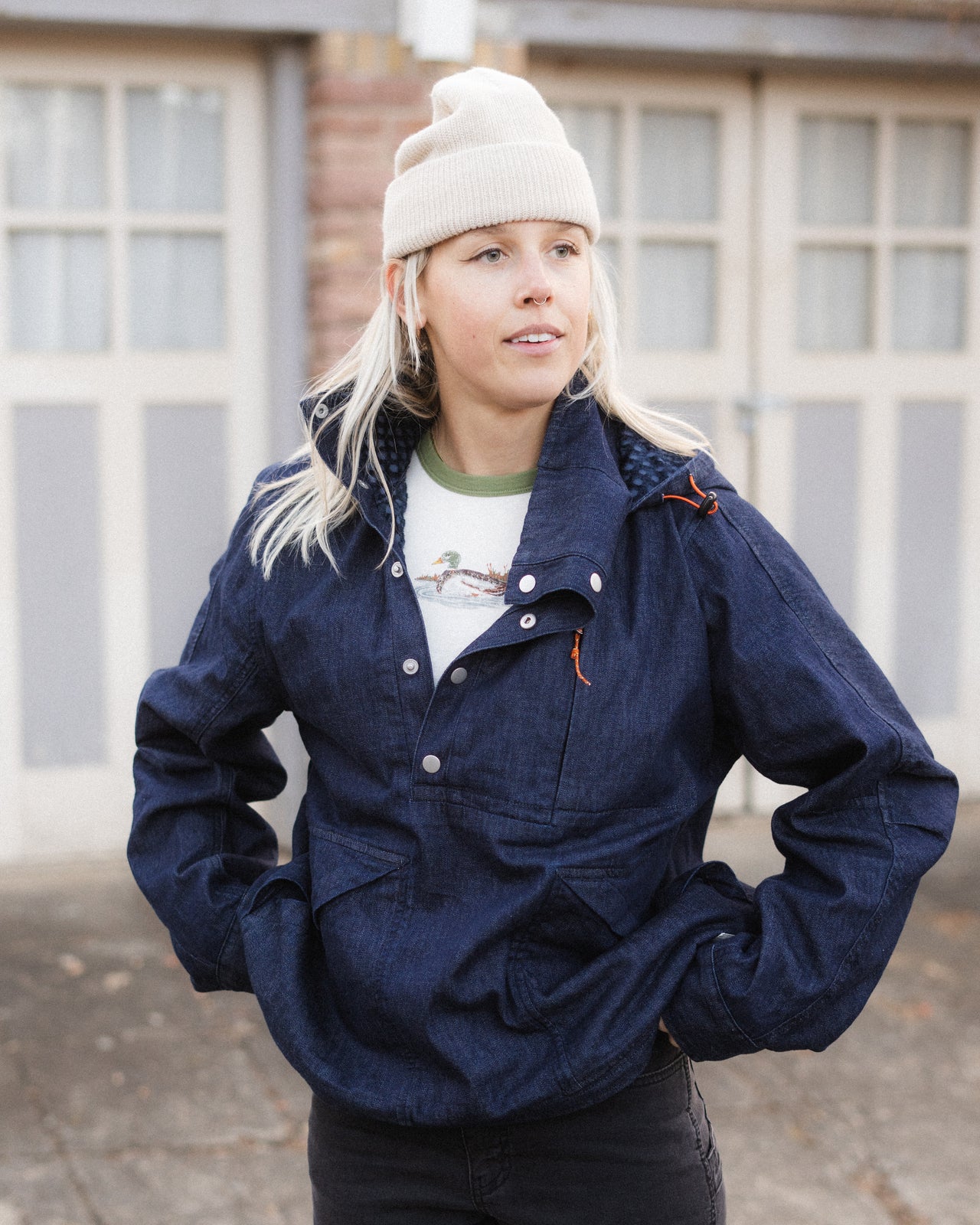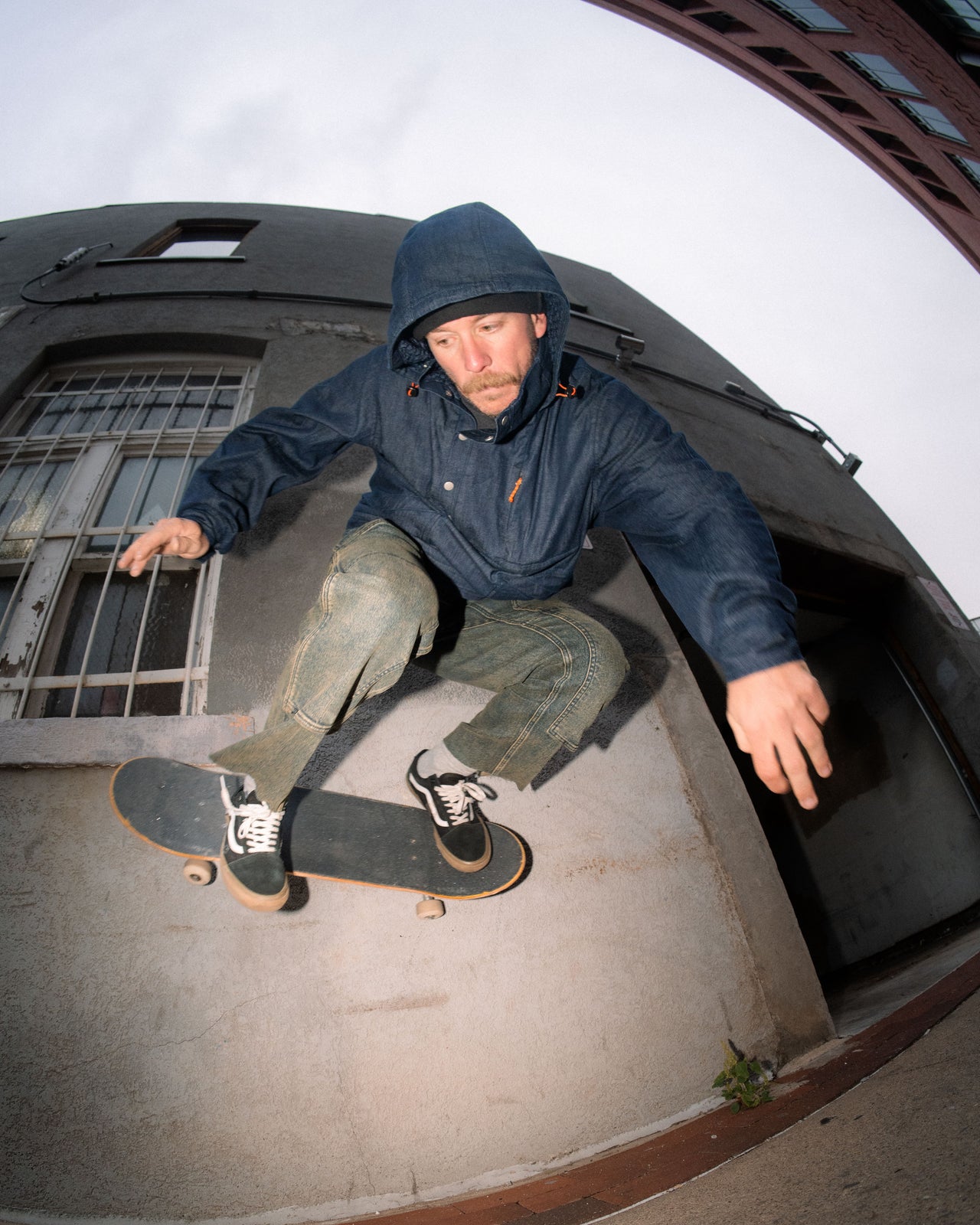 Ripton's most feature-rich garment to date, this anorak has a large hood, adjustable with a drawcord, articulated sleeves, and a zipper opening on the left size. The off-center placket snaps up to your nose. Or if you're hot, it opens halfway down for ventilation. A vented back yoke also promotes airflow.