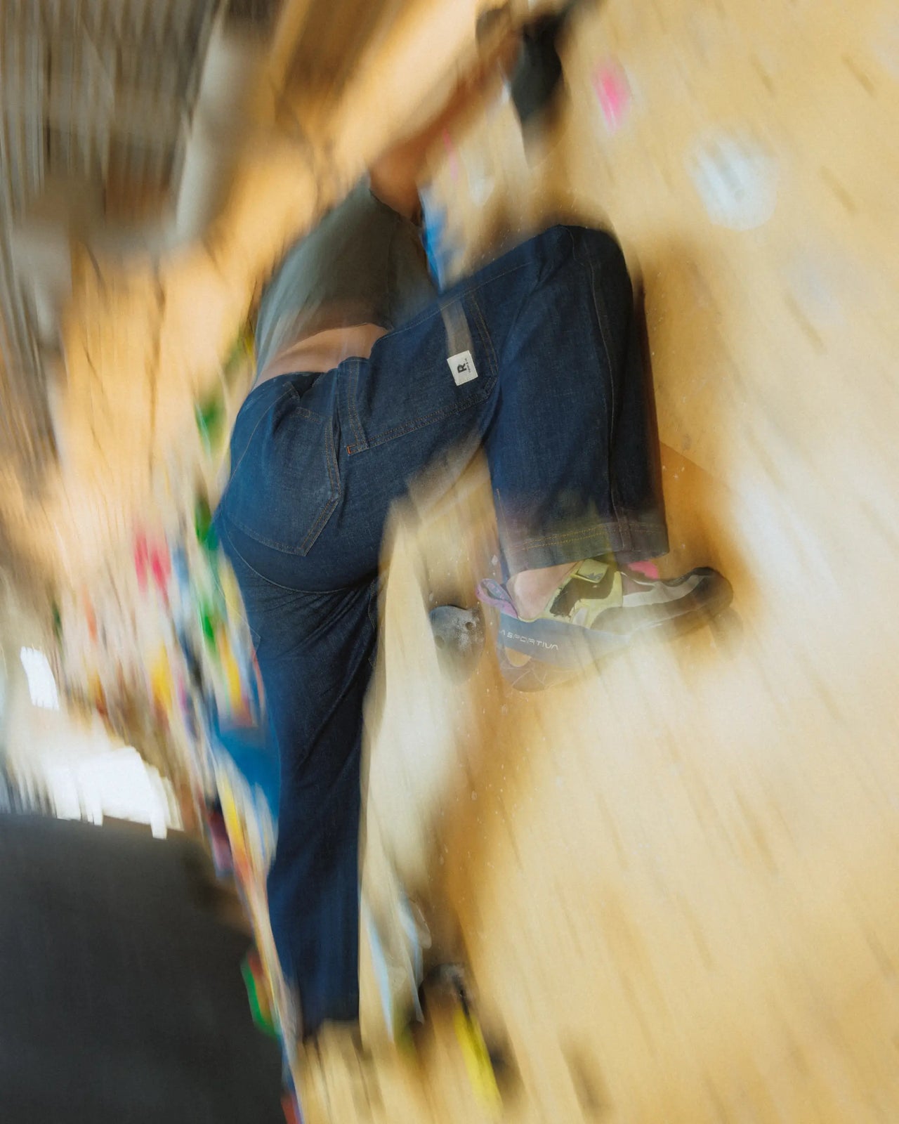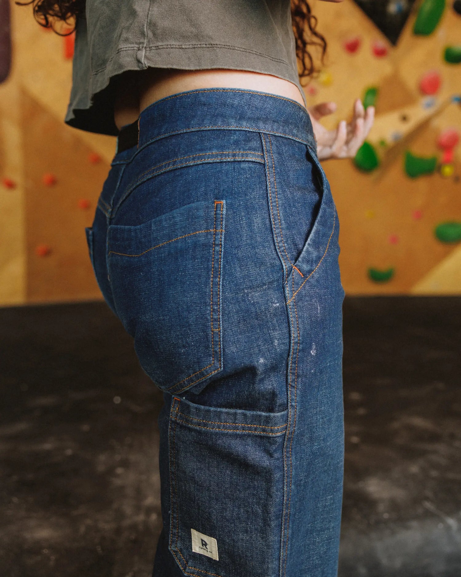 These jeans drape off the hips with generous room through the quads and knees. Strategically placed darts at the knees and cuffs afford greater mobility and a scosche of leg taper for chain clearance.