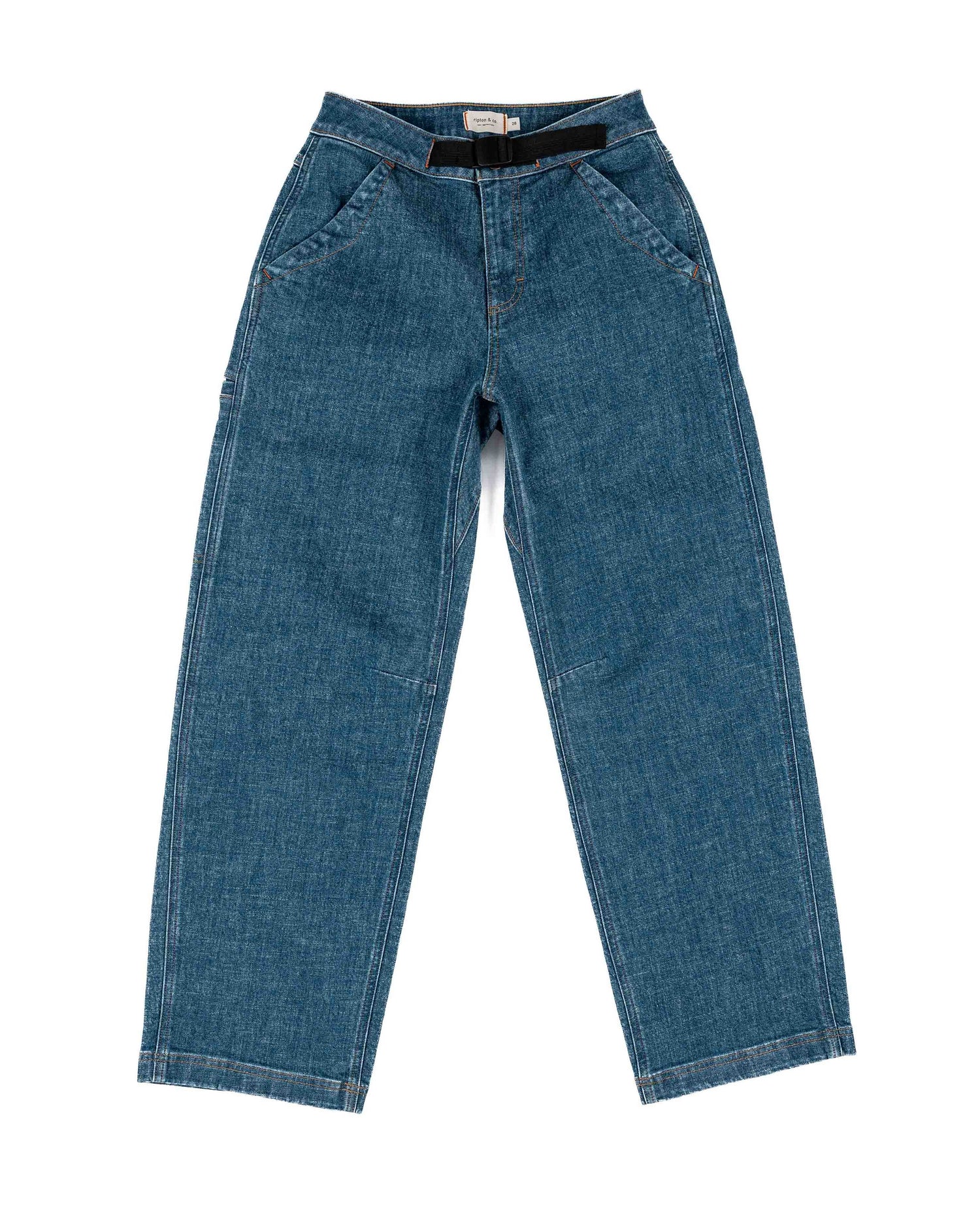 These jeans drape off the hips with generous room through the quads and knees. Strategically placed darts at the knees and cuffs afford greater mobility and a scosche of leg taper for chain clearance.